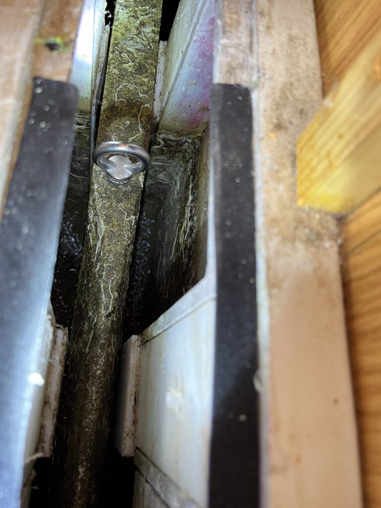 Because we couldn’t remove the longitudinal gliders, reinstalling the centerboard required a bit of creative gymnastics.When putting the board back in, we first had to lift it carefully and guide the board past the gliders before installing the new pivot-pin bushings.