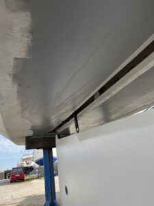 The board was sandblasted to remove old coatings and oxidation by a professional. Then they filled the uneven areas with epoxy, fairing the surface. and applying primer for protection.
